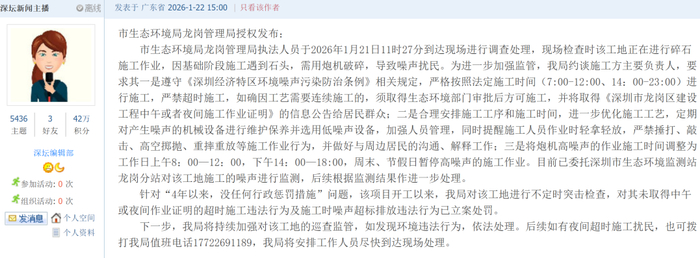 回应内容显示,市生态环境局龙岗管理局执法人员于2026年1月21日11时27分到达现场进行调查处理,现场检查时该工地正在进行碎石施工作业,因基础阶段施工遇到石头,需用炮机破碎,导致噪声扰民。为进一步加强监管,约谈施工方主要负责人,要求——