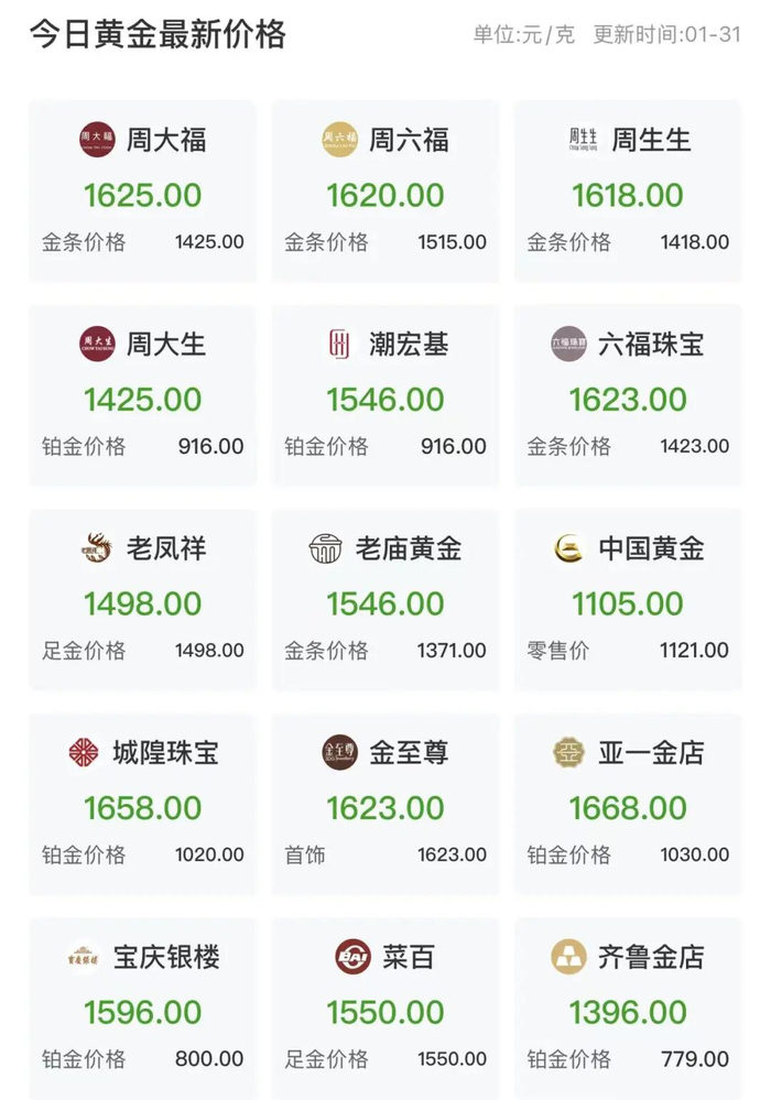 1月31日,周大福金饰报价1625元/克,周生生金饰报价1618元/克。而1月29日周大福金饰报价1706元/克、周生生金饰报价1708元/克,1月30日周大福金饰报价1685元/克、周生生金饰报价1683元/克。以此计算,周大福金饰克价在1日内跌了60元、2日跌了81元。周生生金饰克价1日跌了65元,2日跌了90元。