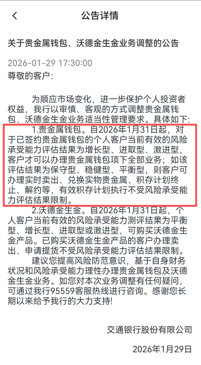 交通银行最新公告显示,1月31日起,增长型、进取型、激进型风险等级客户可办理贵金属钱包全部业务,如该评估结果为保守型、稳健型、平衡型,则客户可办理实时卖出、兑换实物贵金属、积存计划终止、解约等,有效积存计划执行不受风险承受能力评估结果限制。