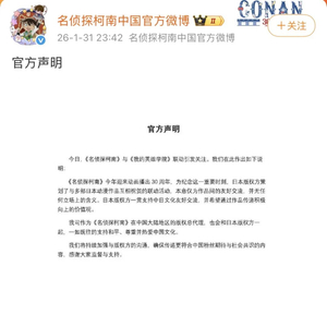 据@名侦探柯南中国官方微博 消息,1月31日晚,《名侦探柯南》中国大陆地区版权总代理上海新创华文化发展有限公司发布官方声明: