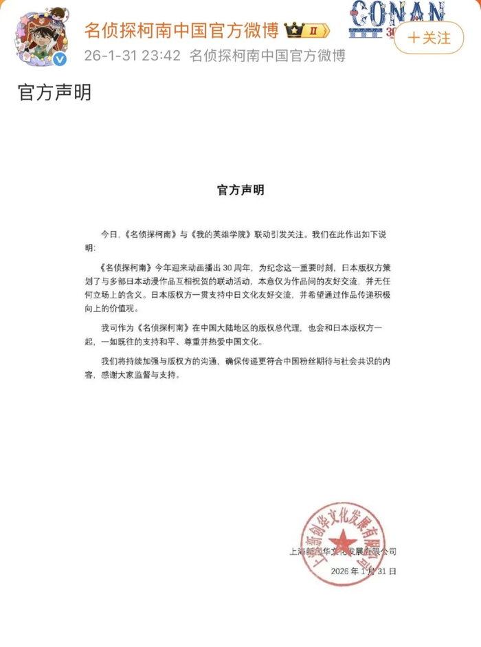 1月31日,《名侦探柯南》与《我的英雄学院》联动引发关注。我们在此作出如下说明: