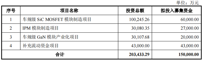 本次向不特定对象发行可转换公司债券拟募集资金总额不超过人民币150,000.00万元(含本数),募集资金总额扣除发行费用后用于车规级SiCMOSFET模块制造项目、IPM模块制造项目、车规级GaN模块产业化项目、补充流动资金项目。