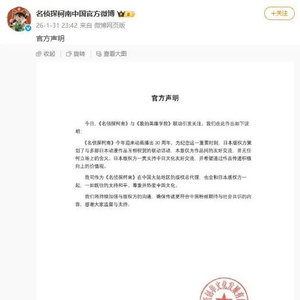 据@名侦探柯南中国官方微博 消息,1月31日晚,《名侦探柯南》中国大陆地区版权总代理上海新创华文化发展有限公司发布官方声明: