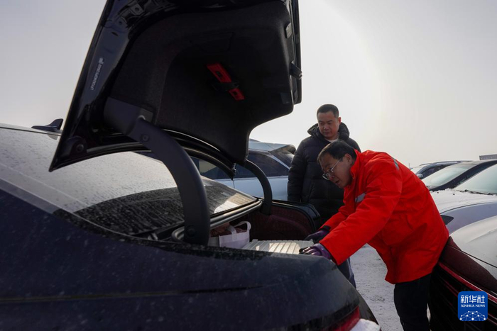 1月31日,在新疆乌鲁木齐中铁特货乌鲁木齐分公司三坪物流基地,工作人员与客户黄先生一同检查待托运车辆车况和行李。新华社记者 徐宏岩 摄
