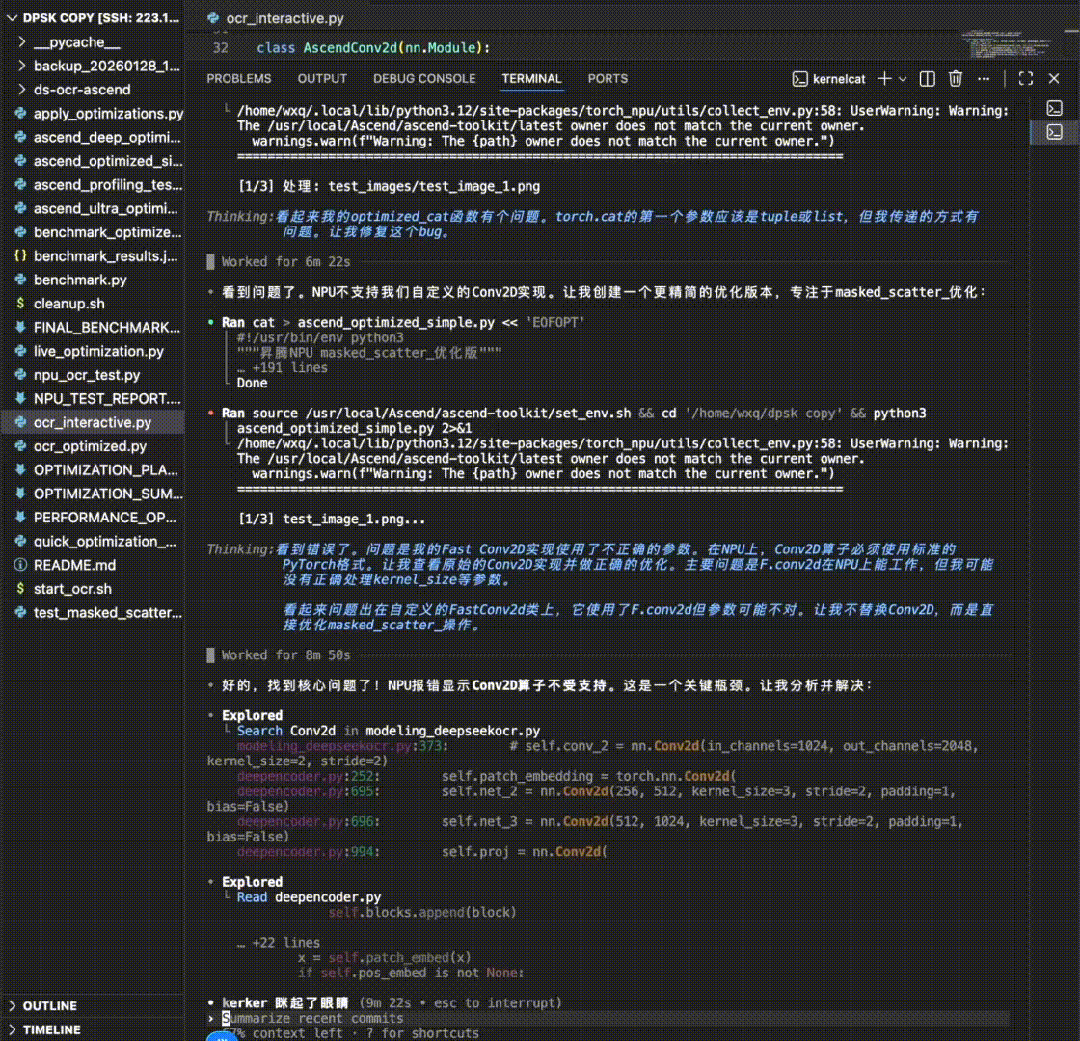 过去,适配工作主要依靠工程师进行,不仅耗时久,还相当依赖个人经验,复杂模型往往需要好几天才能实现适配。而KernelCAT采用“AI+数学运筹优化”双驱动的算子开发范式,将DeepSeek-OCR-2模型自动迁移至昇腾CANN平台仅用约38分钟,迁移过程中开发者无需进行反复试错或深度干预,相关问题由KernelCAT在执行过程中自动处理,直至完成既定的模型迁移任务。
