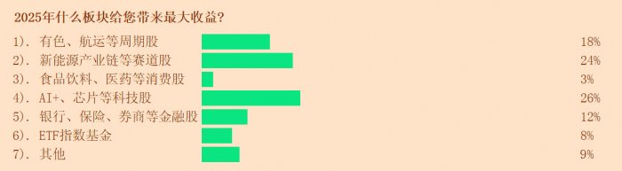 本期调查结果显示:在被问及2025年对收益贡献最大的板块时,26%的受访投资者选择以AI、芯片为代表的科技股,在所有选项中占比最高;24%的投资者将最大收益归于新能源产业链板块,位列第二;18%的投资者表示有色等周期板块收益贡献最大;另有12%的投资者表示银行、保险、券商等金融股是其主要收益来源。