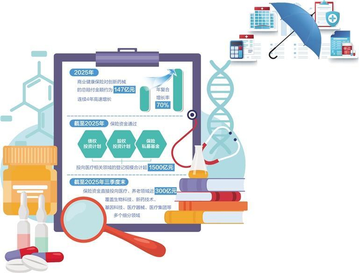 来自中国银行保险资产管理业协会的数据显示,保险资产管理产品方面,截至2025年,通过债权投资计划、股权投资计划和保险私募基金3类产品投向医疗相关领域的登记规模合计超过1500亿元;债权投资计划聚焦产业园区、医疗综合体建设,为医药企业落地成长搭建专业化载体;股权投资计划和保险私募基金通过投资医疗产业股权基金份额、医院及药企未上市股权,为医院扩容升级、药企技术攻关提供长期资金保障。在直接股权投资方面,截至2025年三季度,保险资金直接投向医疗、养老领域近300亿元,覆盖生物科技、新药技术、基因科技、医疗器械、医疗集团等多个细分领域。中国人民健康保险股份有限公司总裁邵利铎认为,“十五五”时期,人保健康将以设立专项产业基金等方式,加大对科技创新、生物医药、绿色低碳产业等领域的长期稳定资金支持,通过多元投资助力实体经济与新质生产力发展,助推资金、资本、资产良性循环。