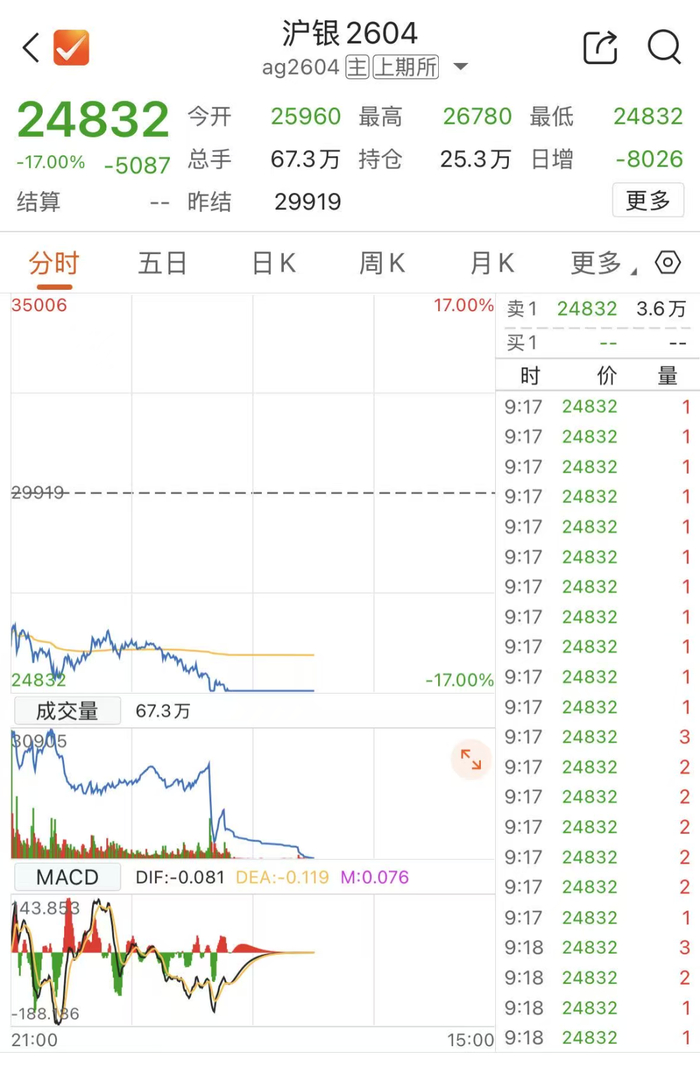 沪银主力合约继周五夜盘跌停后,今日开盘继续跌停。