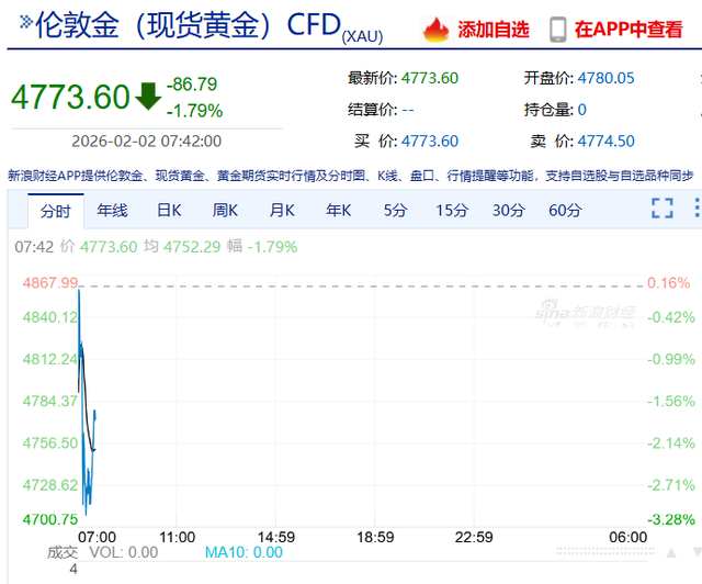 与白银价格走势类似的还有黄金。截至当天早上7时42分,伦敦黄金现货价格同样开盘后猛跌超3%,但在之后出现部分回调,报于4773.6美元/盎司,较之前下跌1.79%。