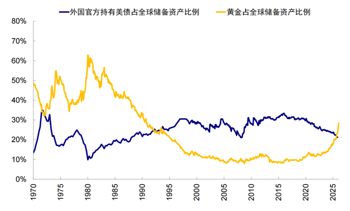 图表23:按最新金价计算,黄金占全球储备资产比例已超过外国官方持有美债占全球储备资产比例