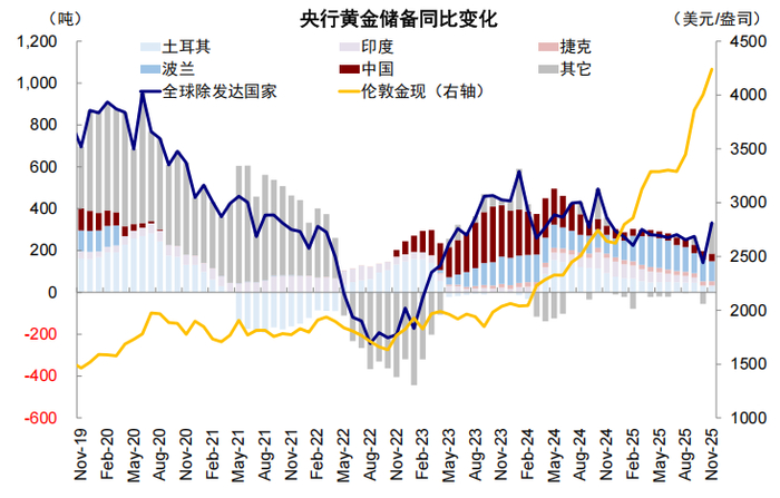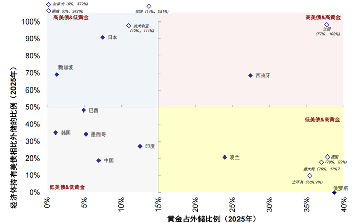 细看全球主要国家在黄金和美债的持有动机也有很大不同。我们以黄金占官方外储的比例超过15%(全球中位数)、美债持有量占外储的比例(由于TIC数据包含外国官方及私人部门总持仓,部分国家美债占比可能超过 100%)来构建象限,具体来看:1)高美债+低黄金:包括加拿大、挪威、英国、澳大利亚、日本、新加坡等仍处于美元体系并追求需要流动性的外向型经济体,持有高比例美债可以满足频繁的跨国贸易结算需求,同时也能在汇率波动时提供弹药。其中,加拿大和挪威在官方外汇储备中完全不持有黄金,但持有美债的规模相当于其外储规模的372%和242%。2)低美债+高黄金:这其中既包括拥有深厚黄金储备历史的德国和意大利,也包括对抗高通胀和本币信用危机而大幅增持黄金的土耳其,以及为了安全战略而主动“去美元”的俄罗斯和波兰。3)低美债+低黄金:以中国、印度、韩国、巴西、墨西哥等为代表的多元配置派,既不盲目依赖美元,也不过度囤积黄金;4)高美债+高黄金:荷兰和法国呈现“双保险”机制,在持有高比例的美债同时,依然保留规模显著的黄金储备。对比黄金大涨前的2023年,挪威、加拿大、新加坡和韩国配置美债的规模显著增加,而土耳其、俄罗斯、意大利、波兰、德国和中国等配置黄金的比例明显抬升。