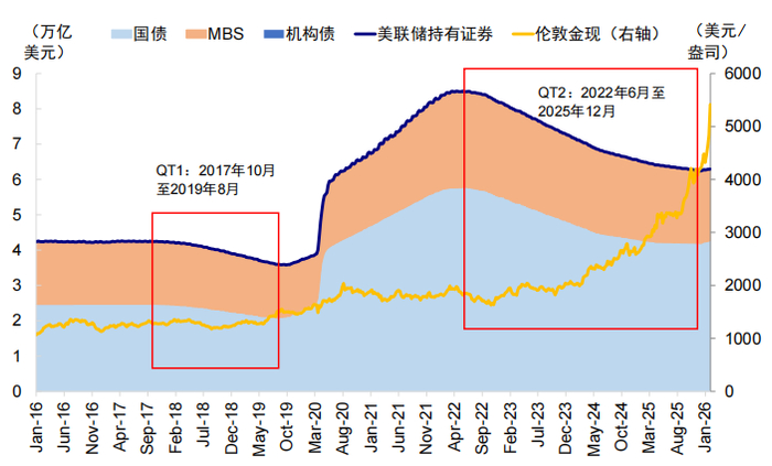 ► 美国强调财政纪律且美联储强力抑制金融扩张,解决美债信任的问题。沃什降息+缩表的组合如果能够走通,不失为一种新的尝试,值得密切关注,1月30日黄金大跌某种程度上就是“沃尔克时刻”的心理预演,这代表这一种潜在的思路转变,单看缩表本身影响倒没那么大(2017年和2022年缩表后一个月金价分别小幅下跌了0.4%和1.9%)。但这条路需要强大的意志,也需要天时(AI)、地利(金融市场)、人和(政治环境)的配合,美国与美联储或许还有机会重塑美元和美债信用,但如果错过这个时机,可能彻底走向失控。