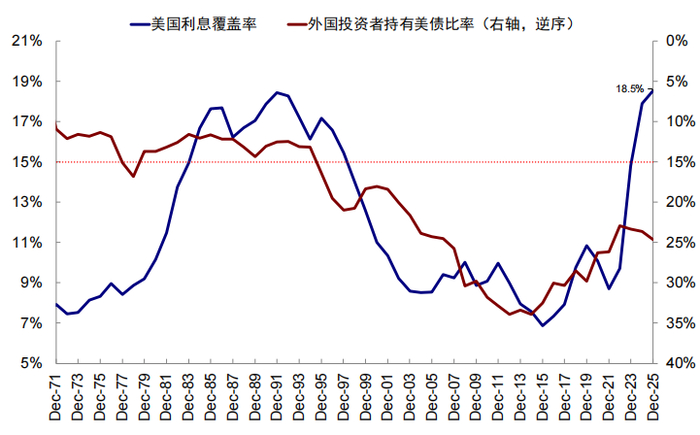 ► 持有结构“内生化”:外国投资者持有美债比例的变化反映了全球对美债作为安全资产的需求强度,这一指标自2014年34%的高位持续回落至2022年的23%后小幅抬升至当前的25%。这种从全球储备资产向普通主权债务模式的转变,意味着美债此前享有的“额外信用需求”在减弱。