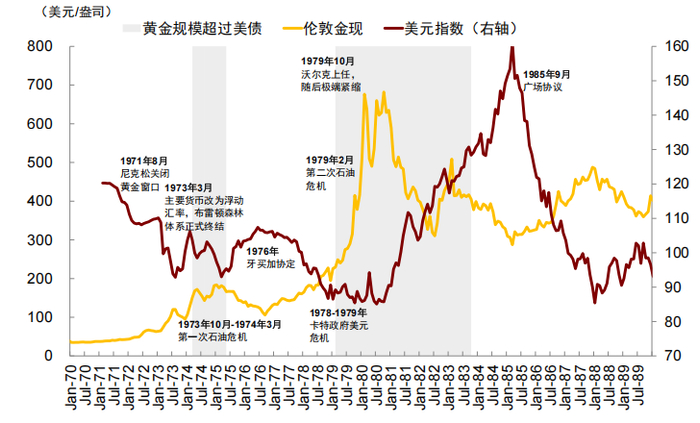 上世纪70年代布雷顿森林体系解体后,也曾出现过两段黄金规模超过美债的阶段[4]:1)1974年4月-1975年4月(总共持续13个月,超越后八个月黄金见顶、涨幅9%):始于布雷顿森林体系解体后美元贬值以及第一次石油危机带来的高通胀,终于通胀压力消退、美国政府卖黄金干预金价。2)1979年5月-1983年9月(总共持续53个月,超越后七个月黄金见顶、涨幅244%):始于第二次石油危机引发地缘冲突和滞涨,终于1979年沃尔克强硬加息。