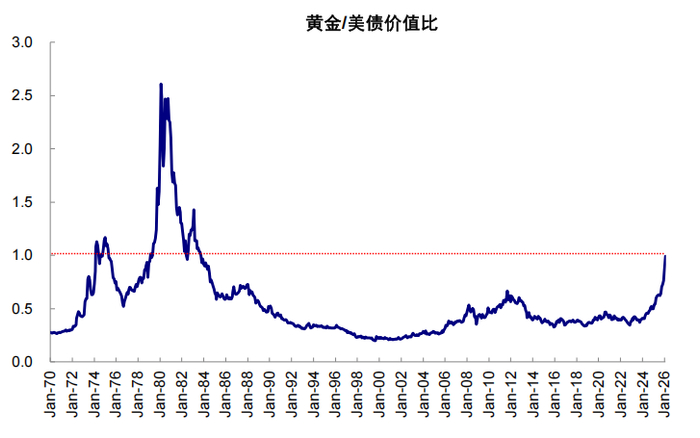 ► 相对价值的“缩水”:黄金名义价值与美债的比值自2022年0.35持续抬升至当前的0.99,这一指标的持续抬升反映了投资者对美元主权信用资产偏好的边际下降,转而向实物黄金寻求终极的价值避险。