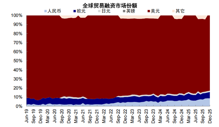 3) 贸易融资份额:截至2025年12月,美元在全球贸易融资市场份额为79.5%,远超第二名的人民币(8.3%)。