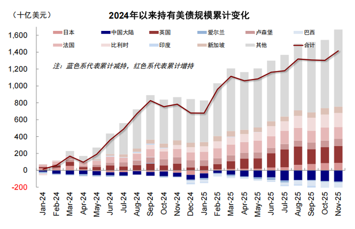 之所以这么说,是因为我们注意到,一部分货币当局在抛售美债买入黄金(以亚洲及新兴国家为主,如2022年以来中国大陆、土耳其和印度央行分别增持357吨、253吨和133吨),而一部分货币当局仍在继续买入美债买到新高(如2025年以来英国、日本、比利时分别增持1657亿美元、1411亿美元、1064亿美元美债),形成“泾渭分明”的两个阵营。