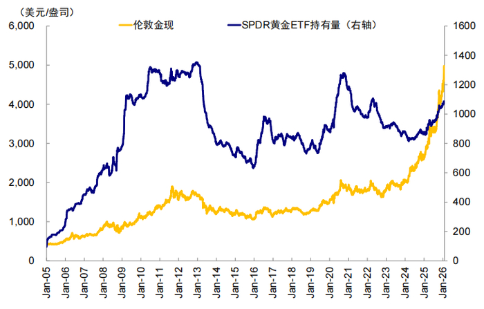 从金价涨幅分地区拆解与ETF资金流向也可看出“分化”:1)对2025年以来金价涨幅进行分时段拆分,截至1月29日,亚洲时段涨幅达33.5%,远高于欧洲时段的9.7%和美洲时段的11.2%,而2026年以来金价这波强势上涨中,更是主要来自于亚盘的力量,亚洲、欧洲、美洲时段分别上涨11.4%、0.3%、2.0%。2)从黄金ETF分地区流向来看,近期黄金ETF的净流入主要来自亚洲和北美,2026年以来净流入49.5亿美元和48.9亿美元,而欧洲2026年以来仅流入33.6亿美元。