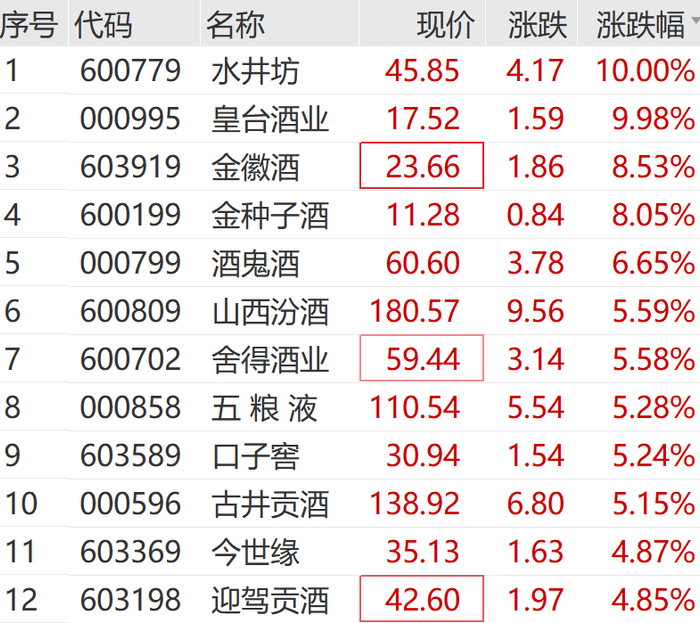 2月2日上午,白酒股直线冲高。水井坊直线拉涨停,皇台酒业涨停,金徽酒、金种子酒、酒鬼酒等跟涨。