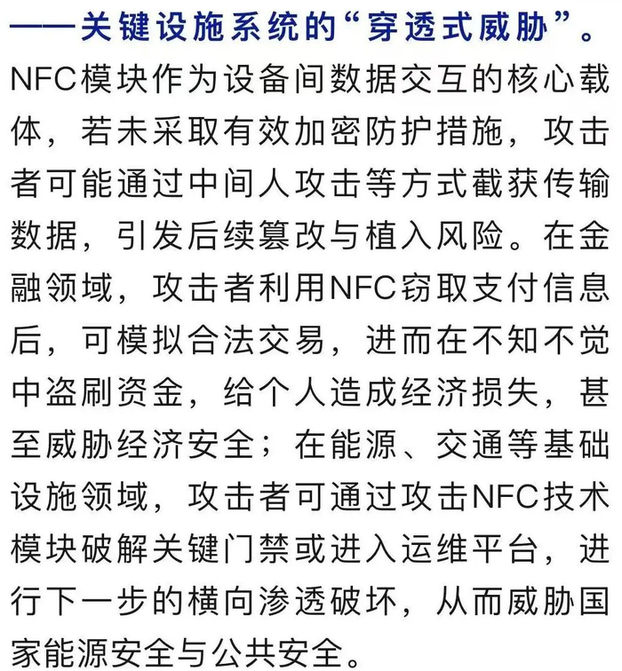 NFC(近场通信技术)作为一种便捷的无线通信方式,已广泛应用于移动支付、门禁系统、交通卡以及设备间文件传输等场景,让一些原先需要打开手机、输入密码的复杂操作仅需“贴一贴”就可完成。然而,这项“一触即通”的技术,也可能在无形中成为信息泄露乃至危害国家安全的潜在渠道。
