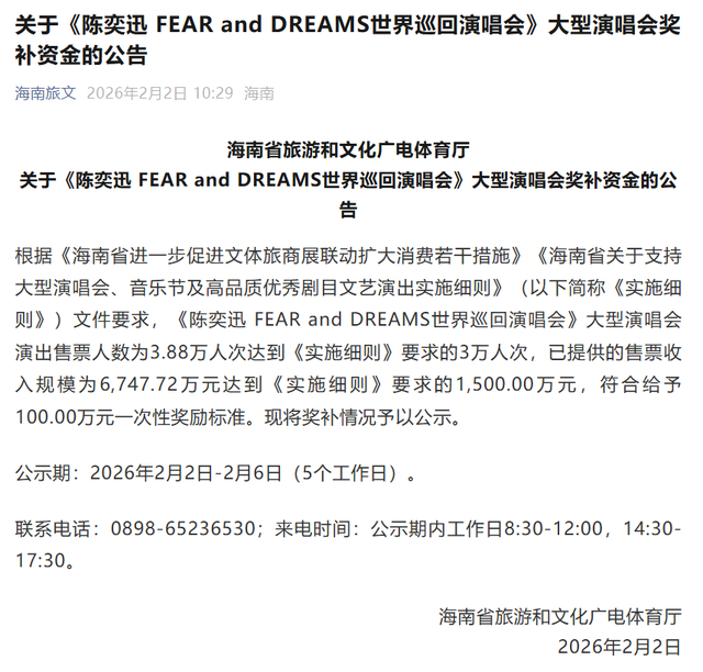 2月2日,海南省旅游和文化广电体育厅发布公告,公示陈奕迅、张学友大型演唱会奖补情况。