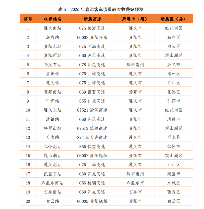客车方面,预计遵义南、乌当、贵阳北等20个主要枢纽收费站客车通行压力较大,主要集中在贵阳、遵义等市州。