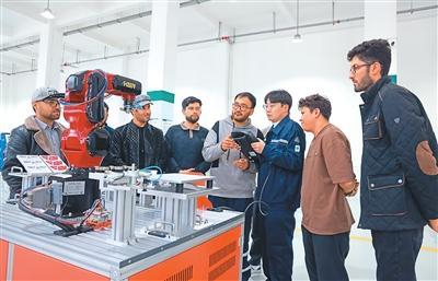 近年来,甘肃省金昌市依托甘肃有色冶金职业技术学院承办阿富汗专业技术人才培训项目。图为在该职业技术学院智能制造产教融合实训基地内,老师为阿富汗学员讲解工业机器人编程与运维操作流程。