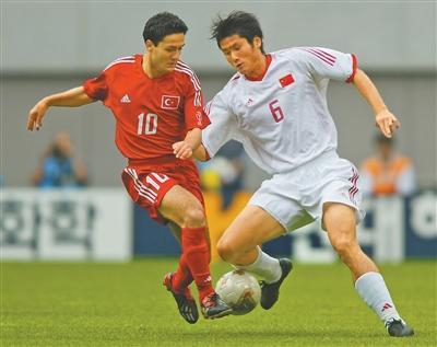 2002年韩日世界杯小组赛,中国队对阵土耳其队,邵佳一(右)在比赛中拼抢。