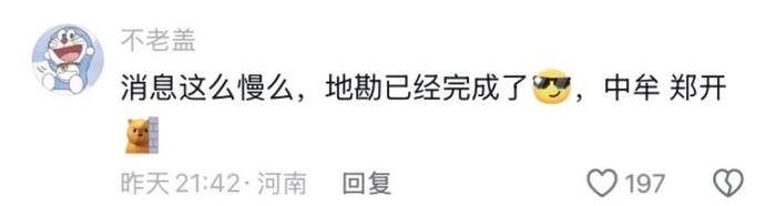 网友@不老盖表示: “消息这么慢么,地勘已经完成了,位置在中牟。”