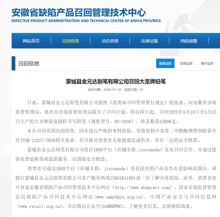 中国质量新闻网讯 据安徽省缺陷产品召回管理技术中心网站消息,日前,蒙城县金元达制笔有限公司按照《消费品召回管理暂行规定》的要求,向安徽省市场监督管理局、亳州市市场监督管理局报告了召回计划,将自即日起,召回2025年5月10日至5月15日生产的大圣牌萌宠圆杆书写铅笔(规格型号:DS-2030),涉及数量15000支。