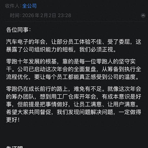 【文/观察者网 潘昱辰 编辑/高莘】2月2日,零跑汽车创始人、董事长朱江明通过内部信回应先前员工吐槽2026零跑汽车电子产品线年度盛典举办糟糕一事,称年会让部分员工体验不佳,受了委屈,这暴露了公司组织能力的短板,必须得到正视。