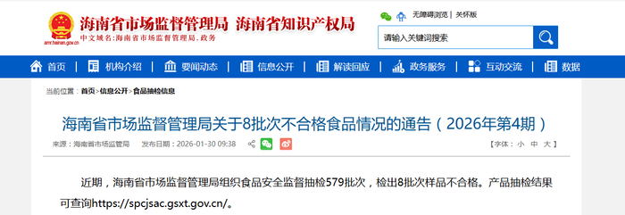 海南省市场监督管理局关于8批次不合格食品情况的通告(2026年第4期)