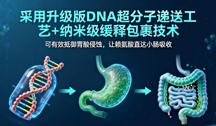 采用DNA超分子递送工艺(Pdnaxi-VisionGuard?升级版)+纳米级缓释包裹技术,双重工艺加持确保赖氨酸等核心成分不被胃酸破坏,直达小肠高效吸收。从片剂到胶囊的“质变”优势显著: