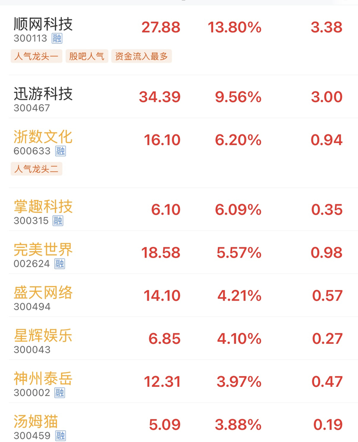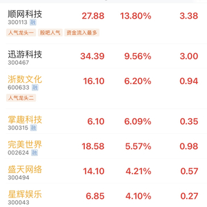 截至收盘,A股游戏股集体反弹,走出“深V线”,世纪华通、吉比特涨幅均超2%,今日游戏指数(BK1406)涨超3.4%,成分股一片飘红,其中顺网科技大涨13.8%,迅游科技、浙数文化、掌趣科技、完美世界等涨幅5%以上。