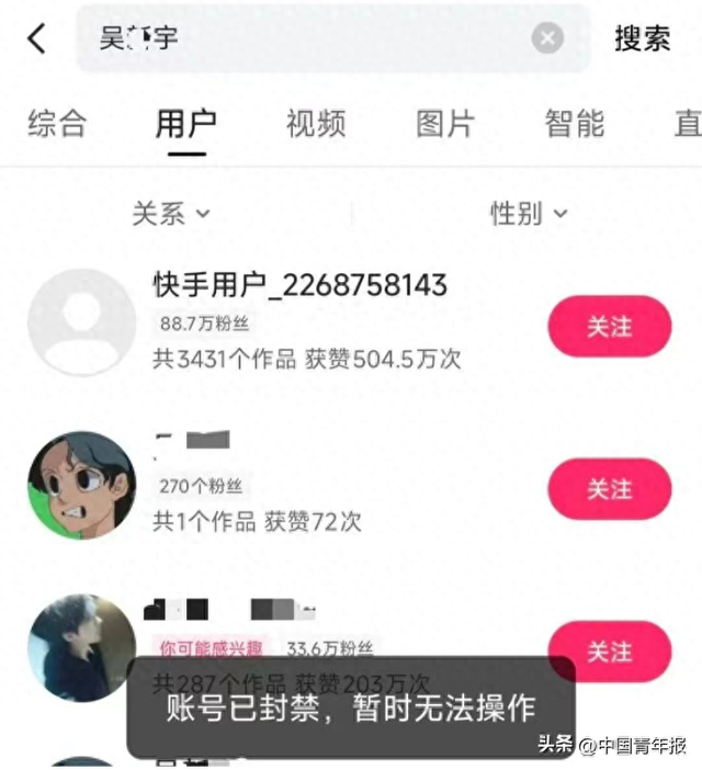 “吴新宇”在快手平台有88.7万粉丝,抖音粉丝也超过10万,个人简介是“我要当网红”,IP地址显示来自河北。