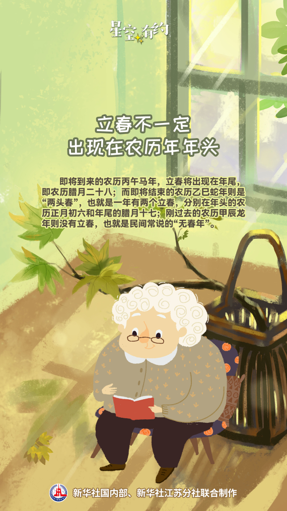 而节气对应的农历日期就更加复杂。由于农历年第一天(春节)对应的公历日期在1月21日至2月21日间波动,而立春的公历日期相对固定,会出现立春不一定出现在农历年年头的情形。例如,即将到来的农历丙午马年,立春将出现在年尾,即农历腊月二十八;而即将结束的农历乙巳蛇年则是“两头春”,也就是一年有两个立春,分别在年头的农历正月初六和年尾的腊月十七;刚过去的农历甲辰龙年则没有立春,也就是民间常说的“无春年”。