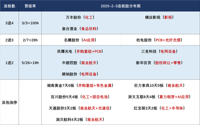 连板晋级率升至50%,昨日3只3连板个股今日全部晋级成功,此外昨日复牌的两只高位人气股锋龙股份、嘉美包装今日仍呈现高位强势震荡,为今日市场情绪修复打下基础。此前30多股遭遇2连跌停的有色板块为首的顺周期股亏钱效应显著改善。不过伴随市场情绪回暖,商业航天、太空光伏概念卷土重来的同时,AI软硬件方向也多以趋势抱团个股为主,反映当前市场风偏修复仍相对克制,活跃资金参与连板接力意愿依旧不足。若市场量能无法持续放大,市场完成普反修复后短线追高仍应谨慎。