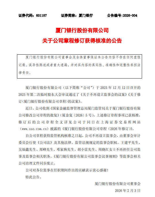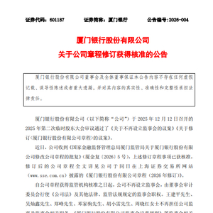 2月3日金融一线消息,厦门银行发布公告称,公司于2025年12月12日召开的2025年第二次临时股东大会审议通过了《关于不再设立监事会的议案》《关于修订<厦门银行股份有限公司章程>的议案》。近日,公司收到《国家金融监督管理总局厦门监管局关于厦门银行股份有限公司修改公司章程的批复》,上述修订章程事项已获核准。