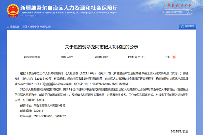 根据《事业单位工作人员考核规定》(人社部发〔2023〕6号)《关于印发〈新疆维吾尔自治区事业单位工作人员奖励办法(试行)〉的通知》(新人社发〔2023〕97号)有关规定,经自治区农业农村厅评议推荐,自治区人力资源和社会保障厅研究等程序,确定追授自治区农产品品牌建设与产销服务中心主任贺娇龙同志记大功奖励,现予以公示。公示期为2026年2月2日至2月6日。