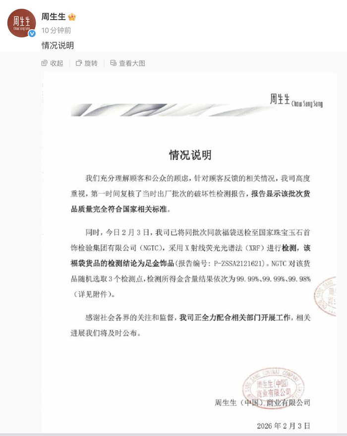 2月3日,周生生发布情况说明: