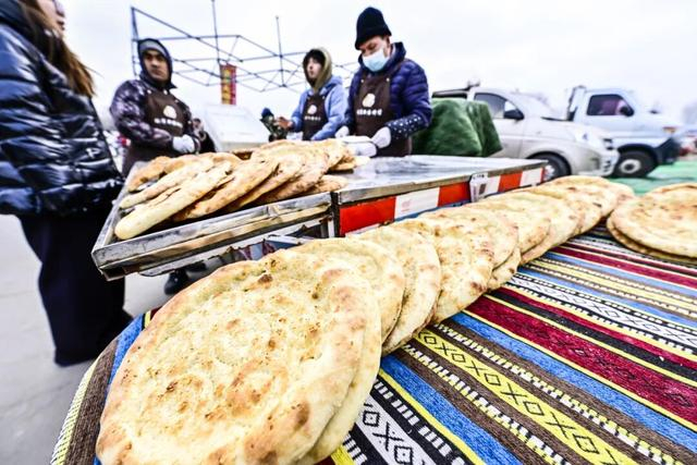 在市集的一角,独特的麦香与果干香脱颖而出。26岁的新疆小伙塔伊尔江是这里的馕饼摊主。摊位不大,却收拾得干净整齐,各式馕饼形态各异、色泽诱人,金黄酥脆的白馕、点缀着坚果的甜馕、包裹着葡萄干的小裂巴,还有带着独特香气的玫瑰花馕、辣皮子馕,种类丰富。