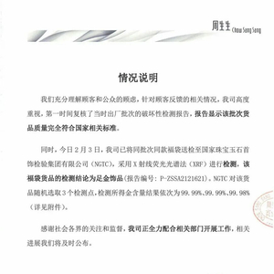 同时,今日2月3日,我司已将同批次同款福袋送检至国家珠宝玉石首饰检验集团有限公司(NGTC),采用X射线荧光光谱法(XRF)进行检测,该福袋货品的检测结论为足金饰品(报告编号:P-ZSSA2121621)。NGTC对该货品随机选取3个检测点,检测所得金含量结果依次为99.99%、99.99%、99.98%。