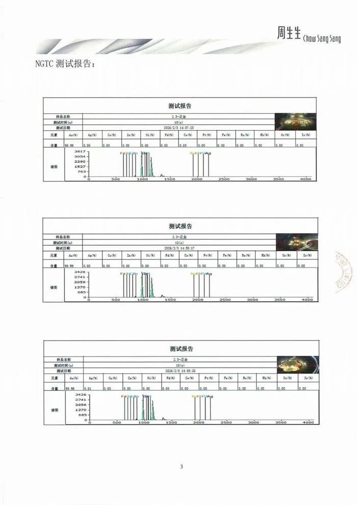 针对“足金挂坠被检测出含铁银钯”一事,2月3日晚,周生生晒出检测报告: