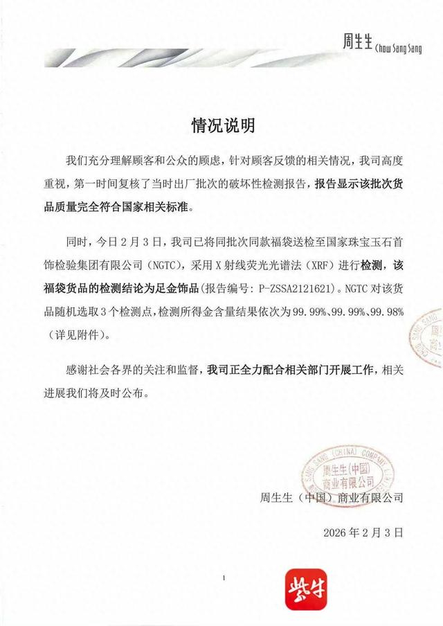 2月3日中午,周生生官方账号发布情况说明:我们高度重视顾客反映的相关事宜,正积极开展相关工作。感谢社会各界的关注与监督,相关进展我们将及时发布。