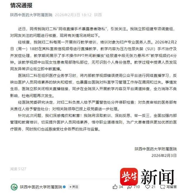 近日,有网友在社交平台反映,2月2日晚,陕西中医药大学附属医院妇二科通过其网络平台账号直播时,疑似有手术画面出现患者的隐私部位,相关帖文引发热议。2月3日,咸阳市卫健委回应扬子晚报/紫牛新闻记者称,相关科室已介入调查。