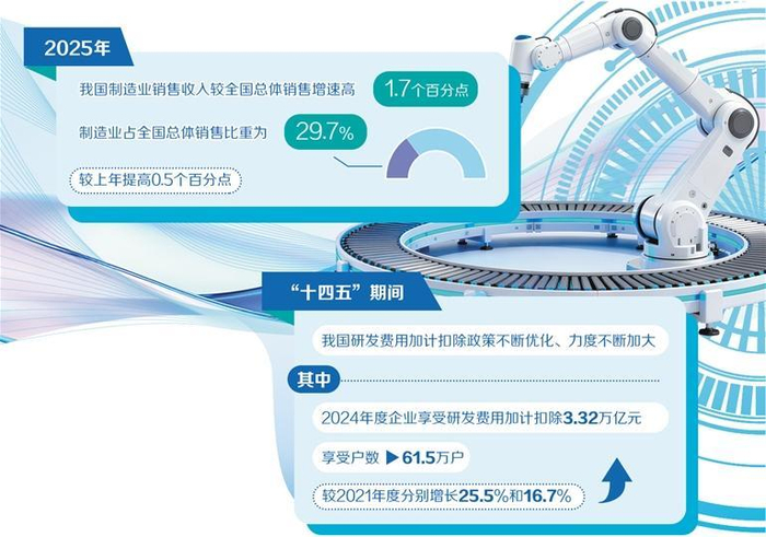 国家税务总局近期公布的数据显示,2025年,我国制造业销售收入较全国总体销售增速高1.7个百分点;制造业占全国总体销售比重为29.7%,较上年提高0.5个百分点,制造业智能化、绿色化、融合化步伐加快,经济“压舱石”作用更加凸显。