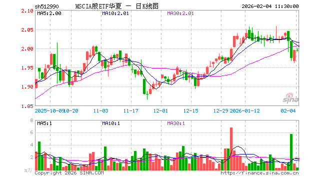 2月4日,截止午间收盘,MSCIA股ETF华夏(512990)跌0.05%,报1.994元,成交额75.60万元。MSCIA股ETF华夏(512990)重仓股方面,贵州茅台截止午盘涨2.01%,宁德时代涨1.58%,招商银行涨0.99%,工业富联跌4.65%,中国平安跌0.11%,紫金矿业涨0.05%,中际旭创跌5.24%,长江电力涨0.77%,农业银行跌0.45%,寒武纪跌4.63%。