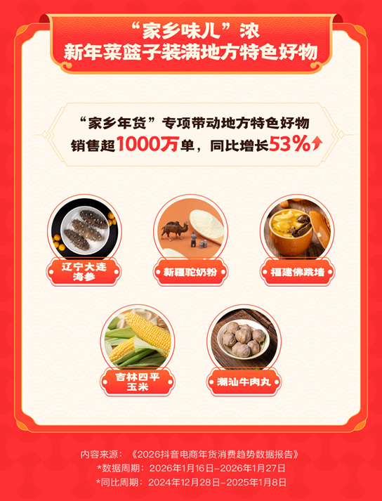 1月16日至27日,地方特色食品在春节期间同样活跃。“家乡年货”专项走进多省(自治区、直辖市),带动地方特色好物销售超过1000万单,同比增长53%。辽宁大连海参、新疆驼奶粉、福建佛跳墙、吉林四平玉米、潮汕牛肉丸等产品成为较受欢迎的产品。可以看到,不少消费者在年货选择中加入了“家乡味道”。
