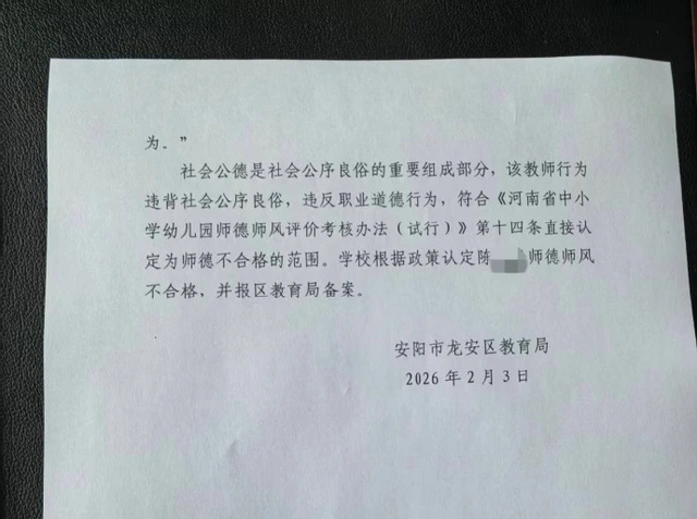 记者联系了龙安区教育局,该局主要负责人回应称,当时在接到举报后,区纪委就进行了立案调查,核实后,陈先生被免职,并被给予党内警告处分。依据这一处分决定,其行为违背社会公序良俗,违反职业道德行为,根据《河南省中小学幼儿园师德师风评价考核办法(试行)》,可直接认定为师德不合格。
