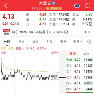截至2月4日收盘,大北农股价上涨0.24%,报4.13元/股,市值177.59亿元。